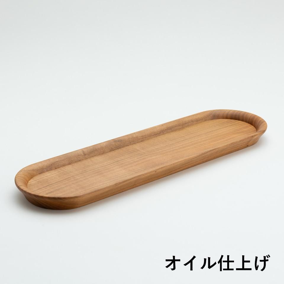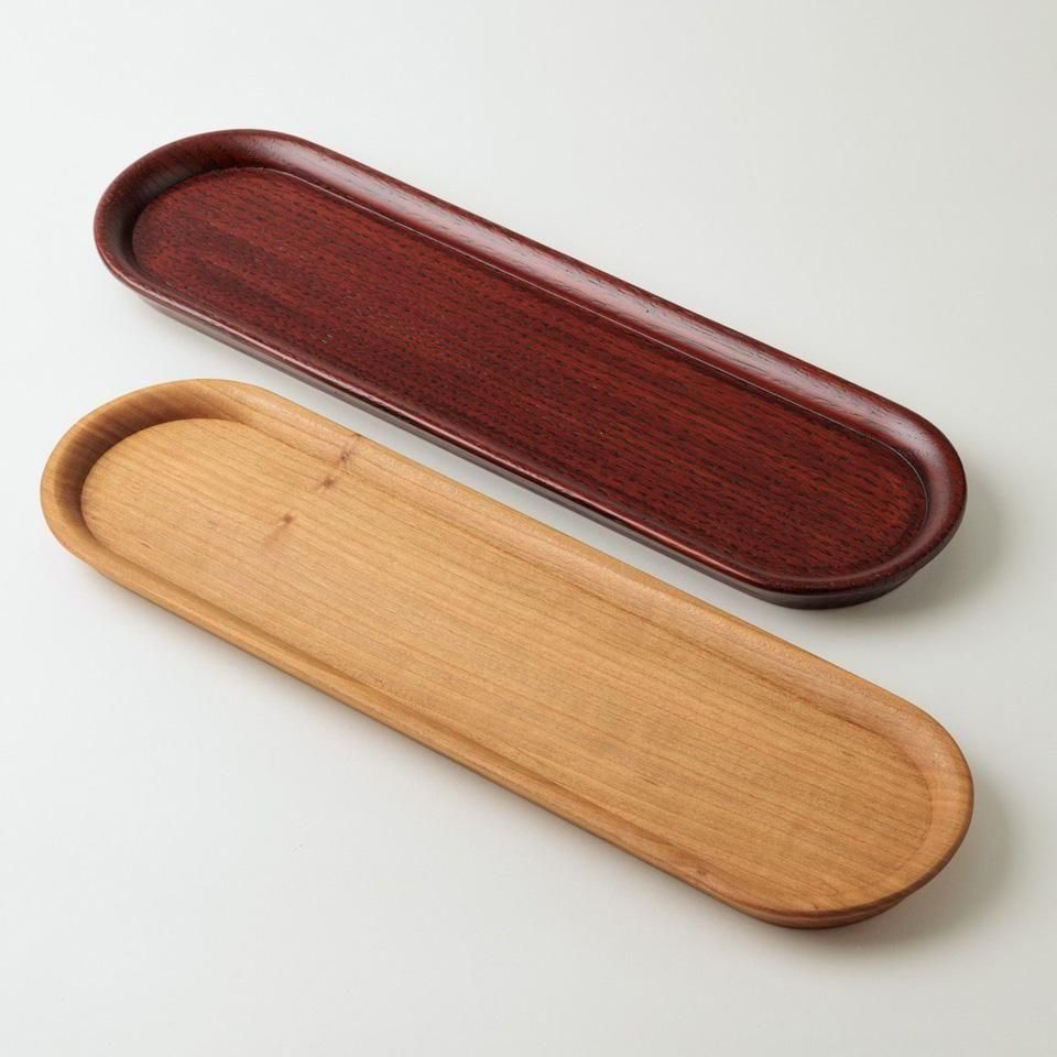 「オイル仕上げ」には国産のヤマザクラを使っています。やや硬質で木目が緻密なサクラは、盆にはもってこいの材料。サクラは日本人には身近な木であるものの、木材として流通する量はとても少ないため貴重です。オイル仕上げのよさは経年変化による色の変化が楽しめ、使い手自身がお手入れできるところ。表面の油分が切れてきたら、クルミ油やエゴマ油を表面に擦り込むと、ツヤがよみがえります。