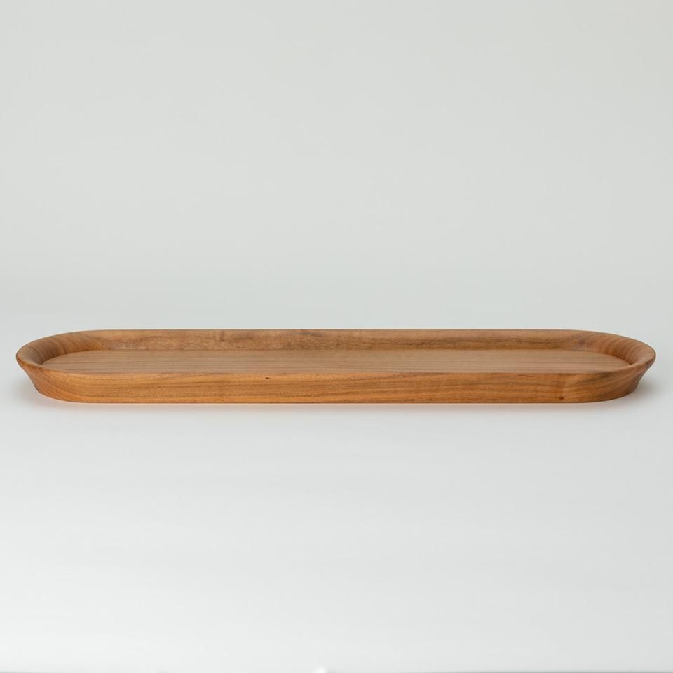 昔ながらの一文字盆は、紫檀(したん)や肥松などの銘木で作られ、仕上げも無塗装のものが中心でした。モノ・モノオリジナル品は、カジュアルに使えるようにサクラやクリなどの里山の木を使い、オイルや拭き漆で仕上げてあります。