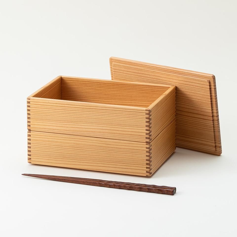 宮崎県で天然杉を使った弁当箱を20年以上製作している黒木勇夫さんの折箱です。ちらし寿司や赤飯、惣菜や和菓子などを詰めるのに便利なサイズ感で表面は業務用食器と同じ塗料でコーティングしてあるため、和食店のリターナブル容器としても使えます。