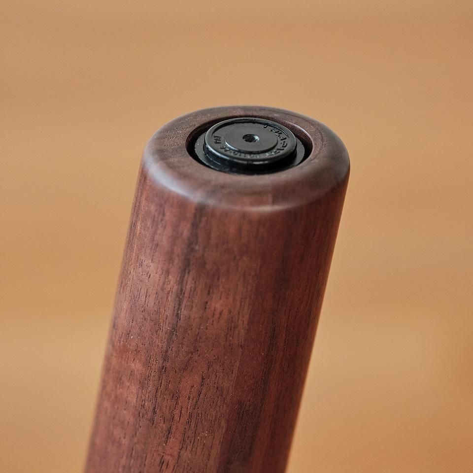 無垢材のテーブルはそれなりの重量となるので、十分な強度設計が欠かせません。本作では、斜めの脚がぐらつかないよう、非常に強固な作りになっています。脚と天板(幕板)とボルト2本でそれぞれ接合。ナットを二重にすることで、定期的に増し締めしなくてもゆるみにくい構造になっています。